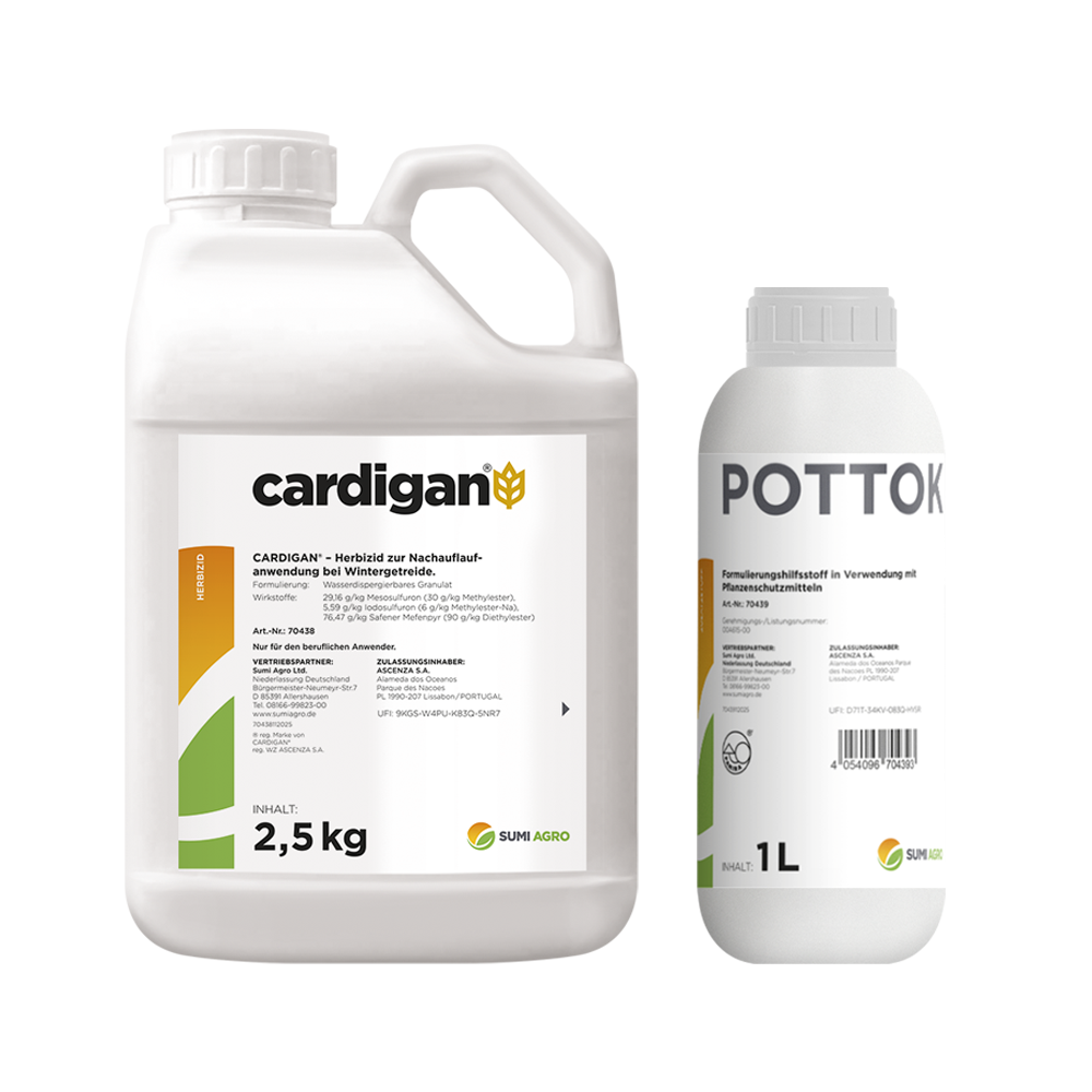 CARDIGAN® SET ist ein Herbizid, das Mesosulfuron-Methyl, Iodosulfuron-Methyl und den Safener Mefenpyr-Diethyl enthält. Beide Wirkstoffe sind Sulfonylharnstoffe, die ALS-Hemmer sind und vom Aktionsausschuss für Herbizidresistenz ebenfalls als Gruppe B eingestuft wurden. Nur eine Anwendung pro Kampagne von ALS-Inhibitor-Herbizid mit Anti-Gras-Wirkung, die mindestens eine der folgenden Substanzen enthält: Mesosulfuron, Iodosulfuron, Imazamethabenz, Propoxycarbazon, Sulfosulfuron, Flupyrsulfuron-Methyl. Zur besseren Wirkstoffaufnahme verwenden Sie CARDIGAN® SET vorzugsweise mit einem Adjuvantöl (Pottok) oder mit einem nichtionischen Tensid in der zugelassenen Dosierung. Wenden Sie CARDIGAN® SET am Ende des Winters/Frühlings von der frühen Bestockungsphase bis zur 2-Knoten-Phase des Getreides an. Gut etablierte Kulturen in einem guten vegetativen Zustand behandeln. Verwenden Sie die niedrige Dosis Cardigan® (0,3 kg / ha) für Unkräuter in frühen Wachstumsstadien und die höchste für Unkräuter in fortgeschrittenen Wachstumsstadien. Verwenden Sie CARDIGAN® SET nur bei Unkräutern, die nicht gegen ALS-Hemmer resistent sind. Vermeiden Sie die Behandlung, wenn in den Tagen vor oder nach der Anwendung eine längere Kälteperiode zu einem Wachstumsstopp der Kultur führt. Vermeiden Sie die Behandlung nach einem Zeitraum von starken Niederschlägen. Starke Temperaturunterschiede während des Behandlungszeitraums oder starker Regen vor der Behandlung können leichte Symptome einer Phytotoxizität (z.B. Gelbfärbung) bei der Kultur verursachen, ohne dass dies den Ertrag beeinträchtigt.